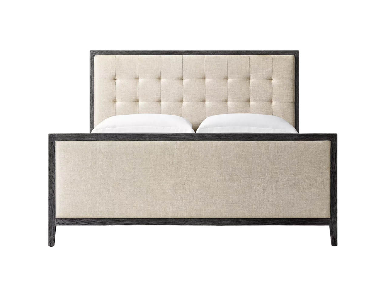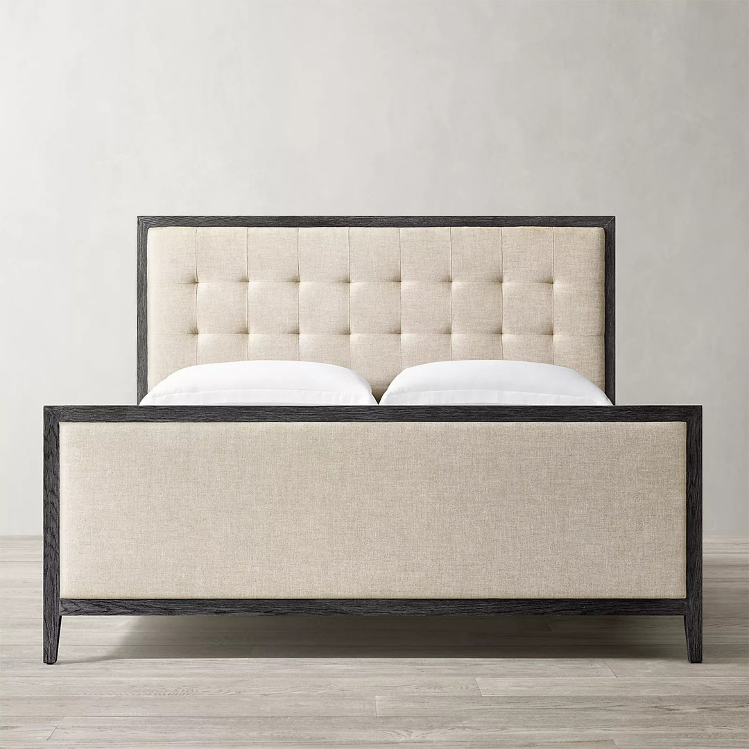 A Cama Diana é a expressão da elegância equilibrada. Com uma imponente moldura em madeira escura que contorna o estofamento em tom bege, esta peça da Coleção Versalhes destaca-se pelo capitonê geométrico na cabeceira e pela peseira alta coordenada. Um design moderno e atemporal que confere sobriedade e luxo ao dormitório.
