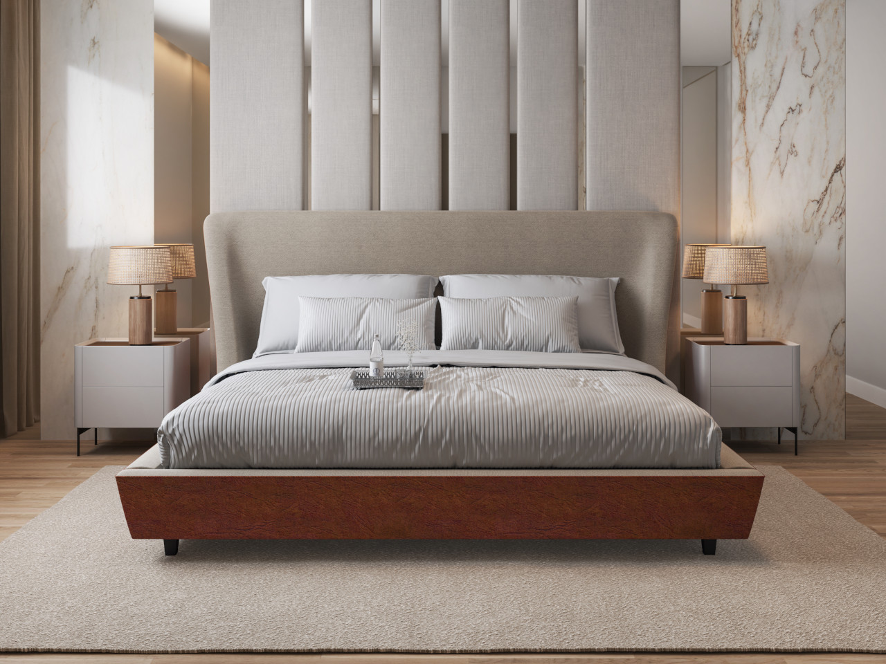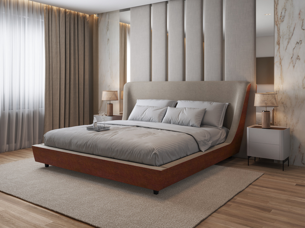 A Cama Estofada Diva é a essência do luxo minimalista, com uma silhueta baixa e fluida que confere leveza e amplitude ao seu quarto. A cabeceira com abas laterais cria uma peça de profundo impacto visual e conforto inigualável.