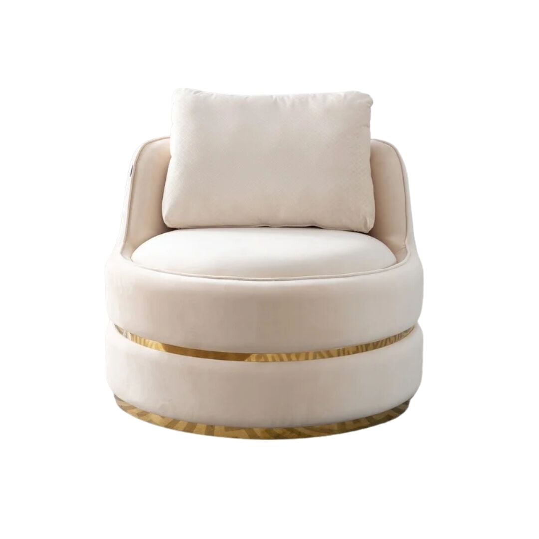 Com assento giratório e moderno, a poltrona Bloom tem um formato cilíndrico com duas faixas douradas ao redor para compor a delicadeza da peça.